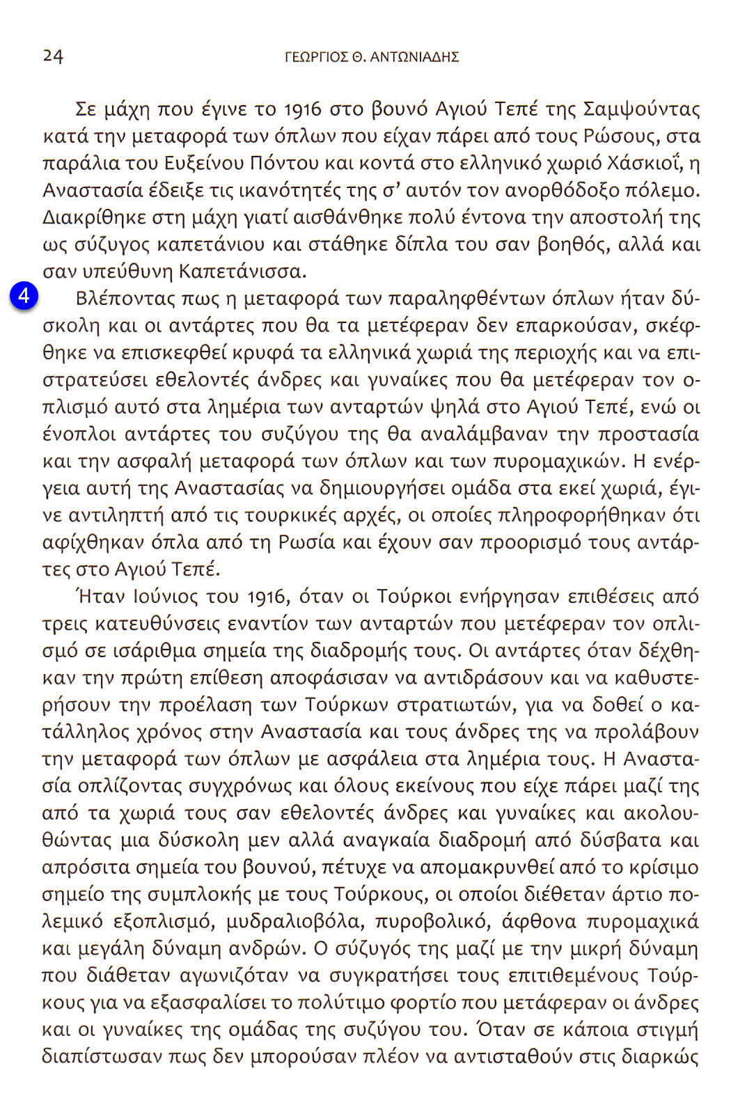 ➤ οι λεπτομέρειες που αναφέρει ο συγγραφέας στην 2η και 3η σελίδα (σημείο #4), δηλ. στην επιστράτευση εθελοντών για την μεταφορά του οπλισμού, στις επισκέψεις της σε διάφορα Ρωμαίϊκα χωριά, δεν μας είναι γνωστές από κανένα βιβλίο εξ όσων διαβάσαμε. Ούτε μας βοηθάει ο Αντωνιάδης με κάποιες σχετικές παραπομπές σε βιβλιογραφία. Είναι δε τόσο παραστατικά δοσμένα που σίγουρα κάποιοι αυτόπτες μάρτυρες του τα διηγήθηκαν.